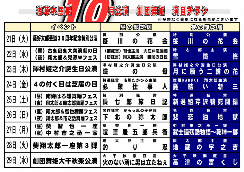 | 公演期間 | 10月1日~10月29日 ※10月14日休演日 10月20夜の部 | |